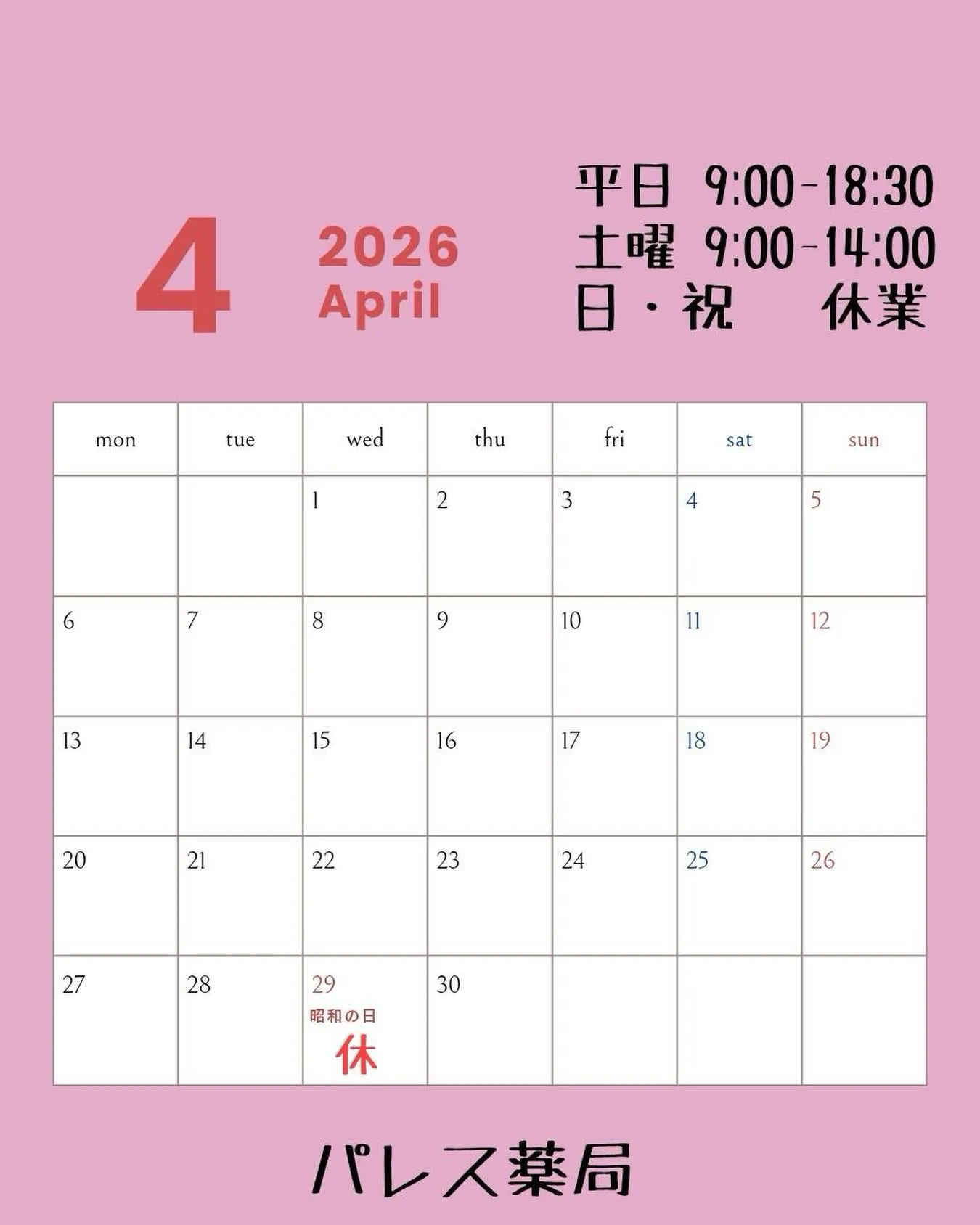 こんにちは🌞 パレス薬局です♪ 4月営業日になります💊 #調剤薬局 #服薬指導 #訪問在宅 #健康相談